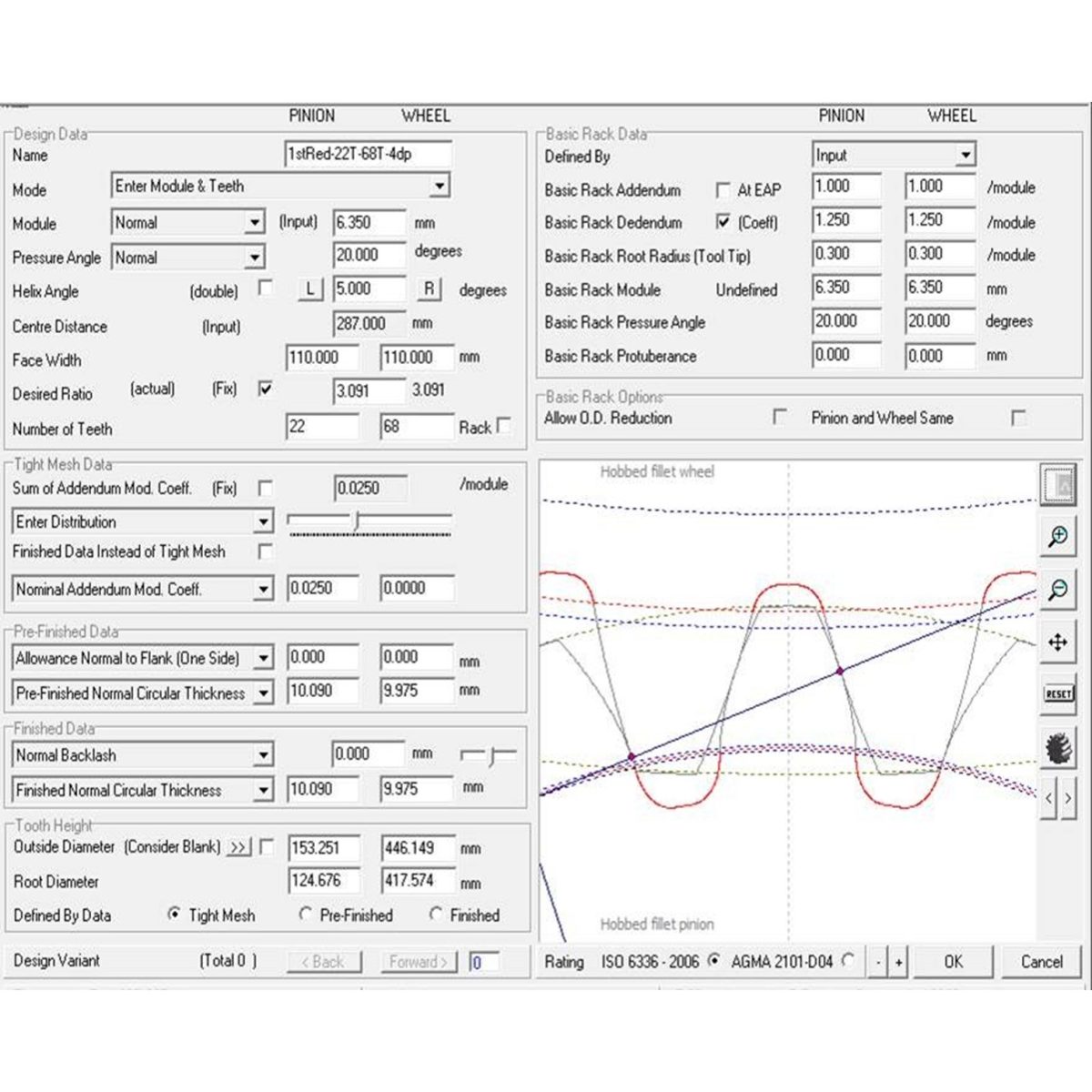 GPS applies the ISO 6336 standard to rate spur and helical gears, and it allows rapid comparison of different geometry and material configurations, helping the designer establish a suitable and cost-effective solution. When verifying a design, both gears can be modelled running together, possible design problems can therefore be spotted and eliminated at an early stage.